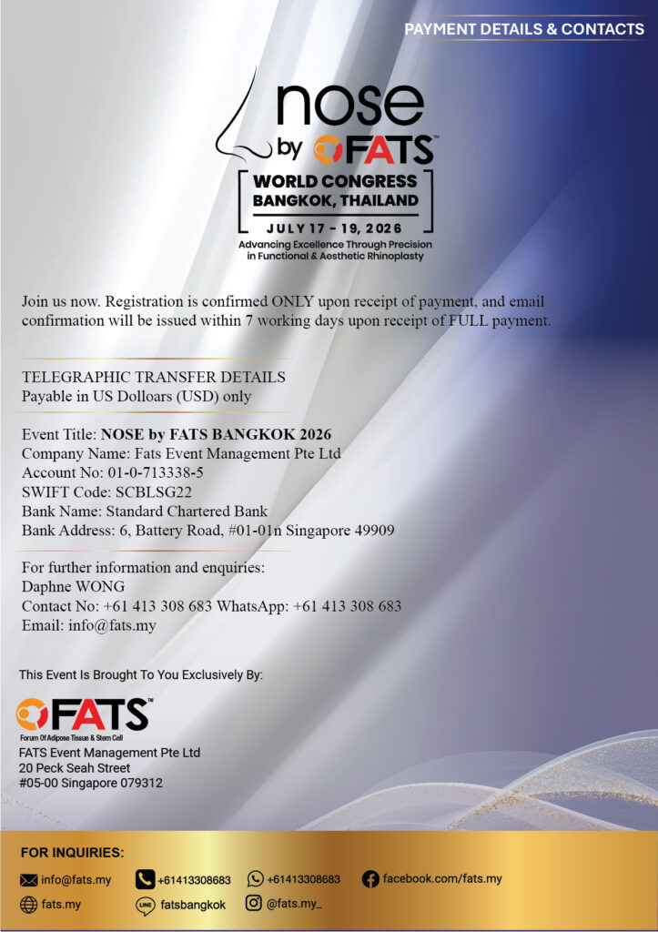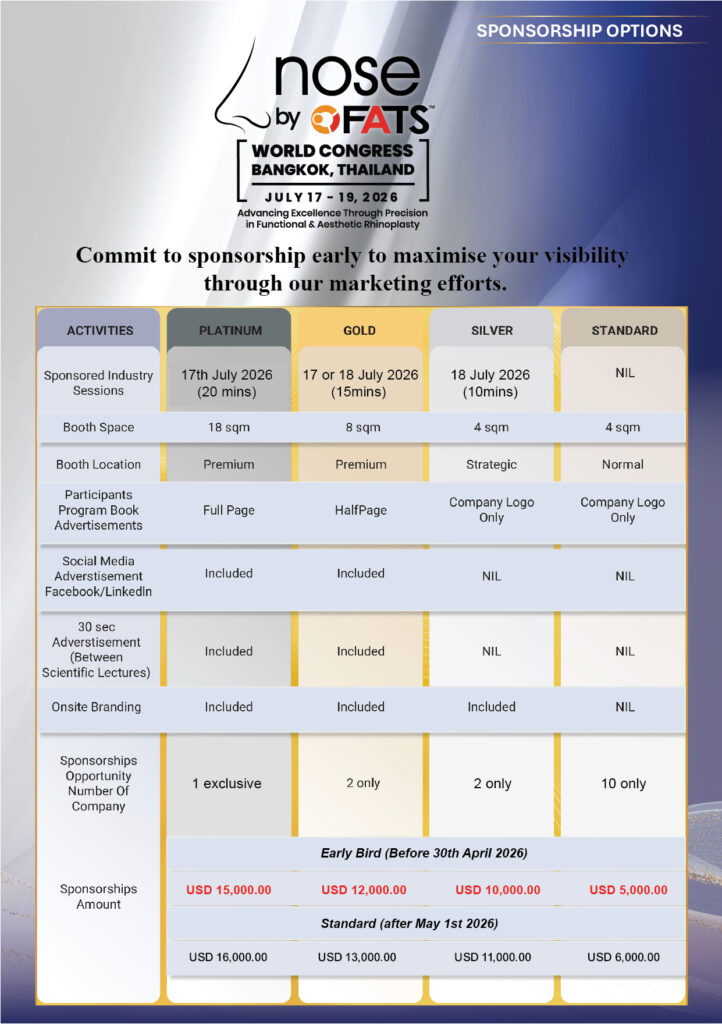 SPONSORSHIP OPPORTUNITIES Sponsors receive unparalleled brand exporsure and exclusive benefits before, during and after the Congress.Get prime visibility in front of all the delegates at FACE by FATS BANGKOK 2026.Utilize the Congress’ sponsorship opportunities to strategically position your company.Commit to sponsorship early and maximize your visibility through pre-Congress marketing efforts.Contact our team to discuss sponsorship opportunities for your company : +61481338661 (Mobile) or +61413308683 (WhatsApp)